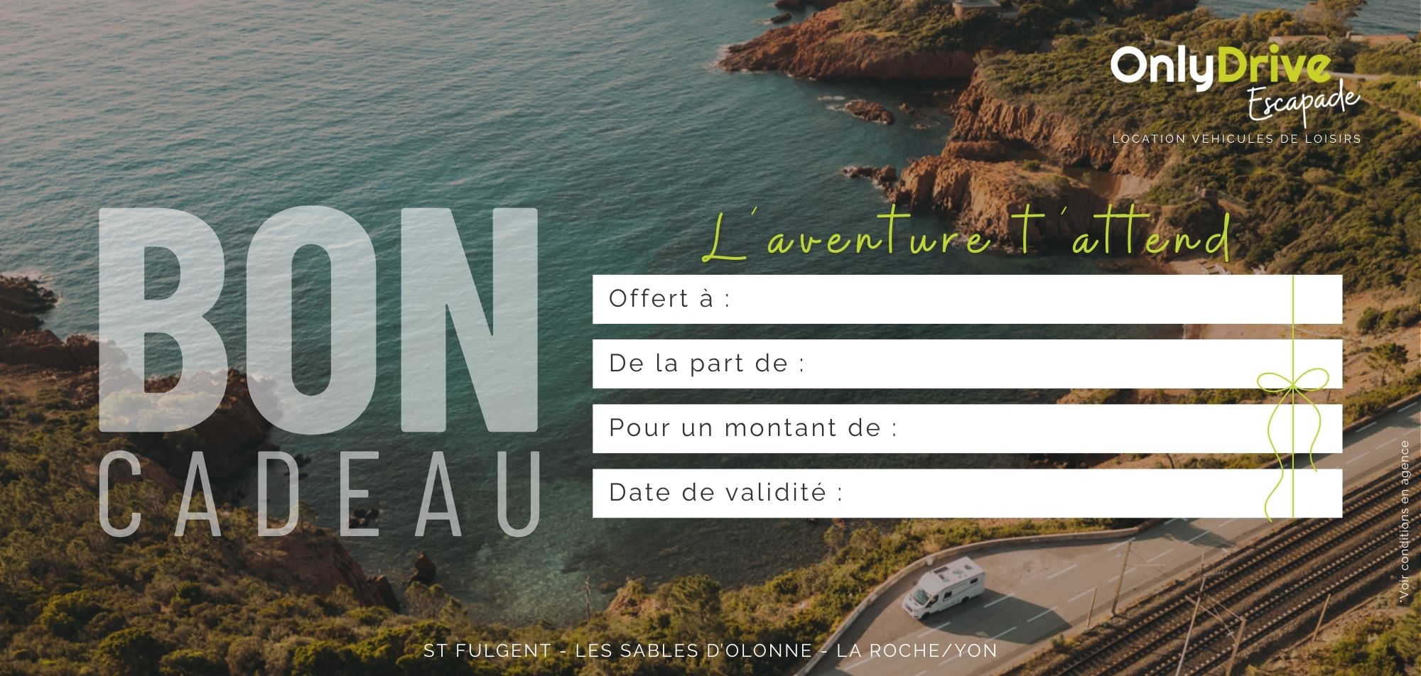 Un Bon Cadeau Onlydrive peut être utilisé pour la réservation d’un camping-car, van ou fourgon aménagé, disponible sur l’ensemble du site onlydrive (sous réserve de disponibilité).